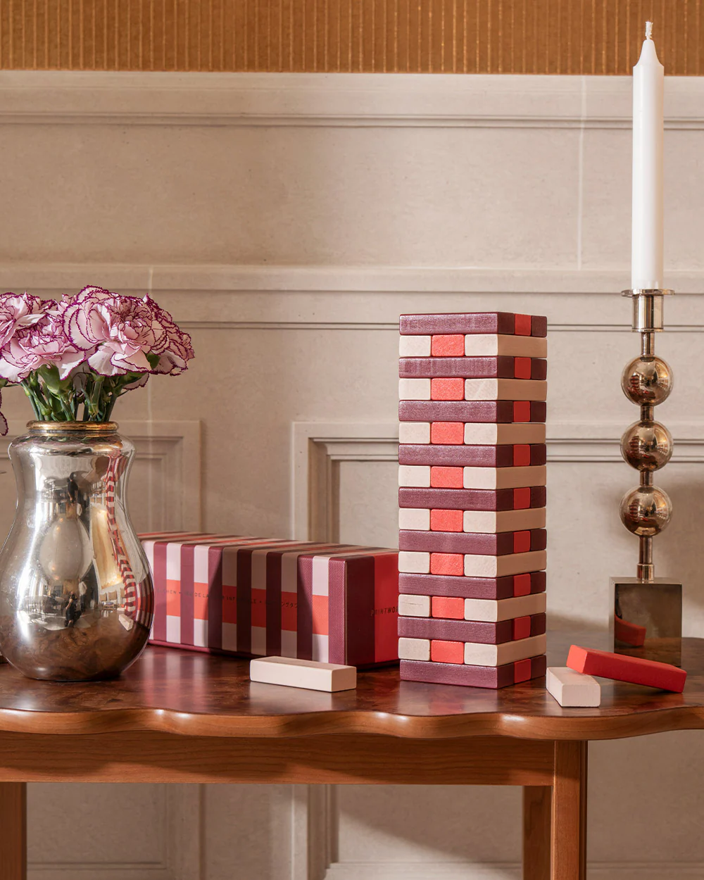 A classic game, now in bold red. Our Tumbling Tower adds a playful pop to any room - made of solid wood and designed to stand out. Whether you're playing with friends or adding color to your shelf, it's made to last and to be loved. Includes instructions in English, French, and German. Measures 28.5 x 8.5 x 8 cm.
